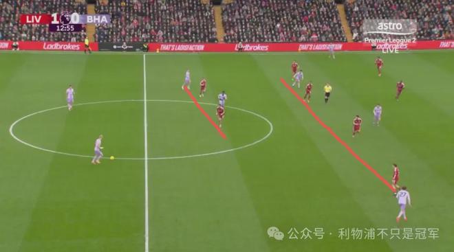 这两人这样使用,避免维尔茨在前场逼抢中的过多跑动和体能消耗,又用麦卡利斯特保证了前场逼抢的力度。两人在攻防转换当中的位置非常灵活多变,让对方更加无所适从。